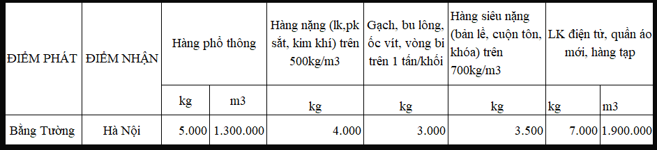 BẢNG GIÁ CƯỚC VẬN CHUYỂN KHO BẰNG TƯỜNG